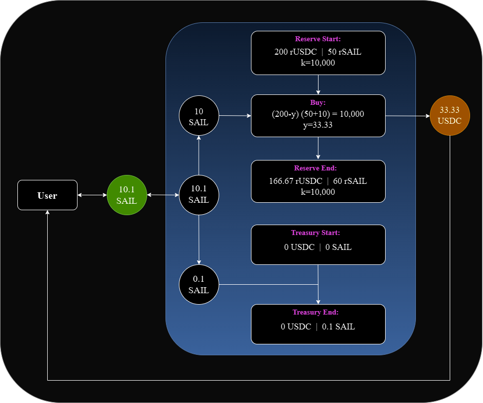 The user sells **10.1 SAIL** to the bonding curve and receives **33.33 USDC** (calculated using the price formula). Before the transaction, the reserves were **200 rUSDC** and **50 rSAIL**.